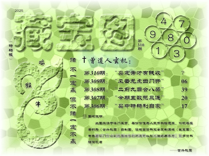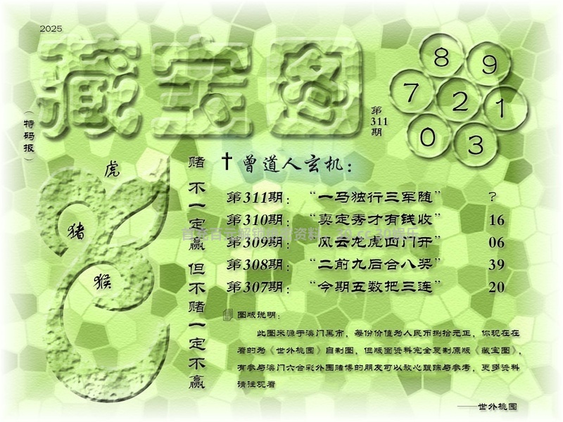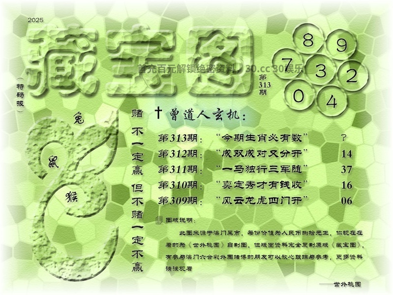 313期藏宝图曾道人玄机:今期生肖必有数 解:今期生肖必有数,解龙马鼠蛇狗鸡兔虎猪 解特肖:龙马鼠蛇狗鸡兔 |