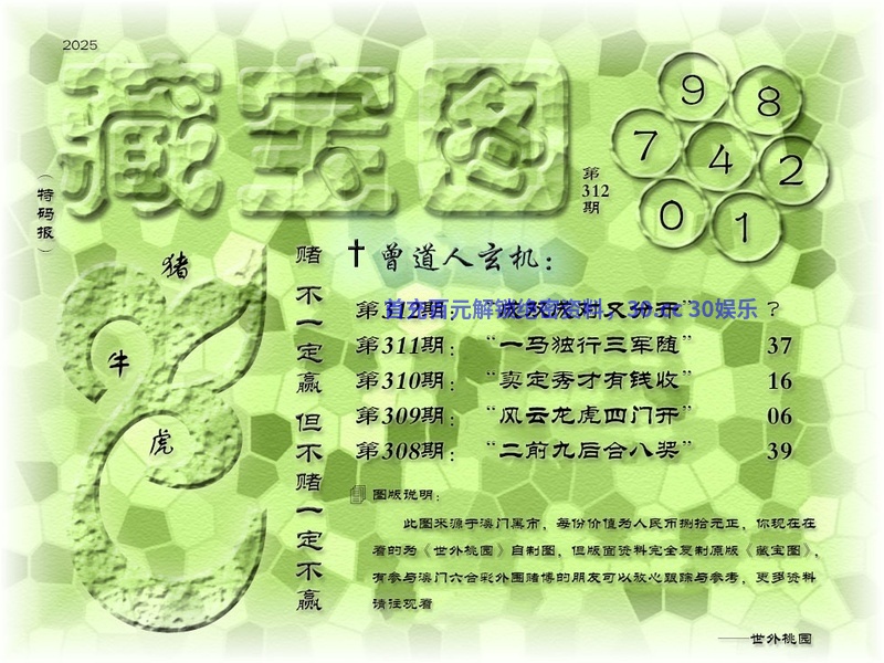 312期藏宝图曾道人玄机:成双成对又分开 解:成双成对又分开,解双肖虎狗龙猴马鼠 解特肖:虎狗龙猴马鼠牛 |